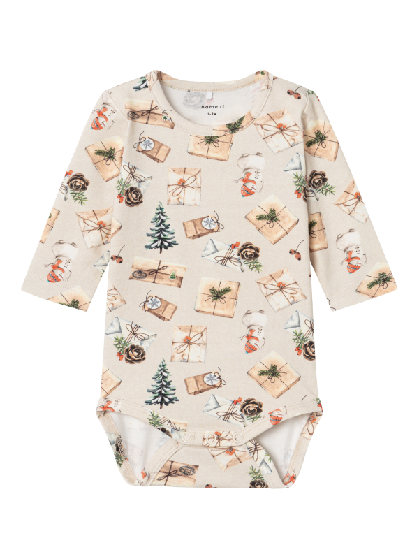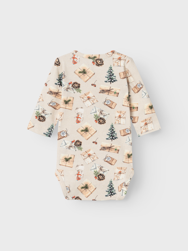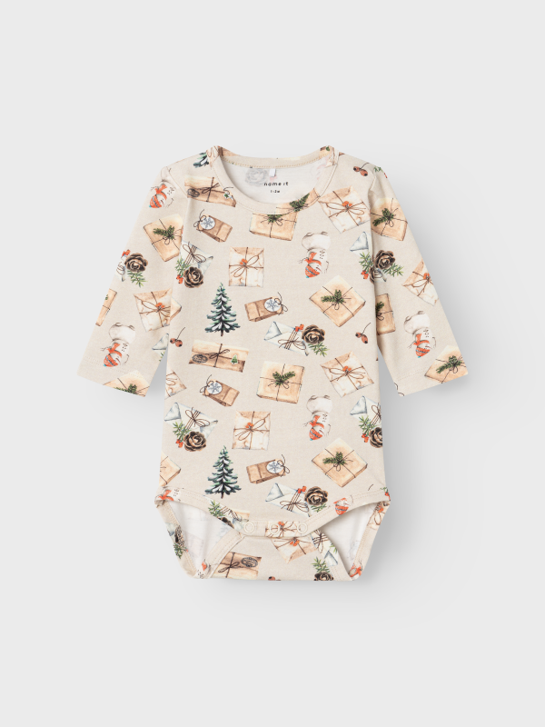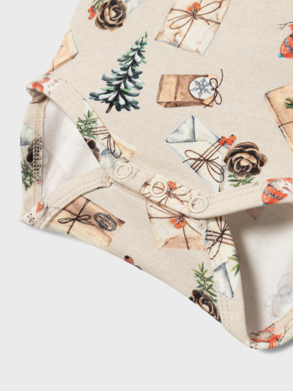 Blød bodystocking med det sødeste mønster af julemotiver. Trykknapper ved den ene skulder samt bund.